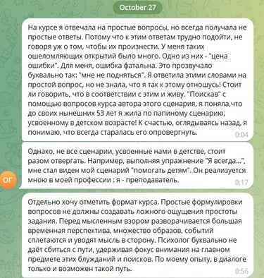 «До программы я не замечала, как живу по чужому сценарию. Всё время ходила по кругу — одни и те же ситуации, одни и те же чувства. Теперь я вижу, откуда это, и могу выбирать по-другому».